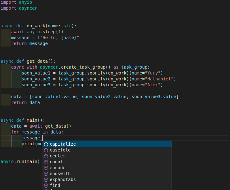 Because of the way Asyncer is designed, you will get typing support in these SoonValue objects and their soon_value1.value attribute.